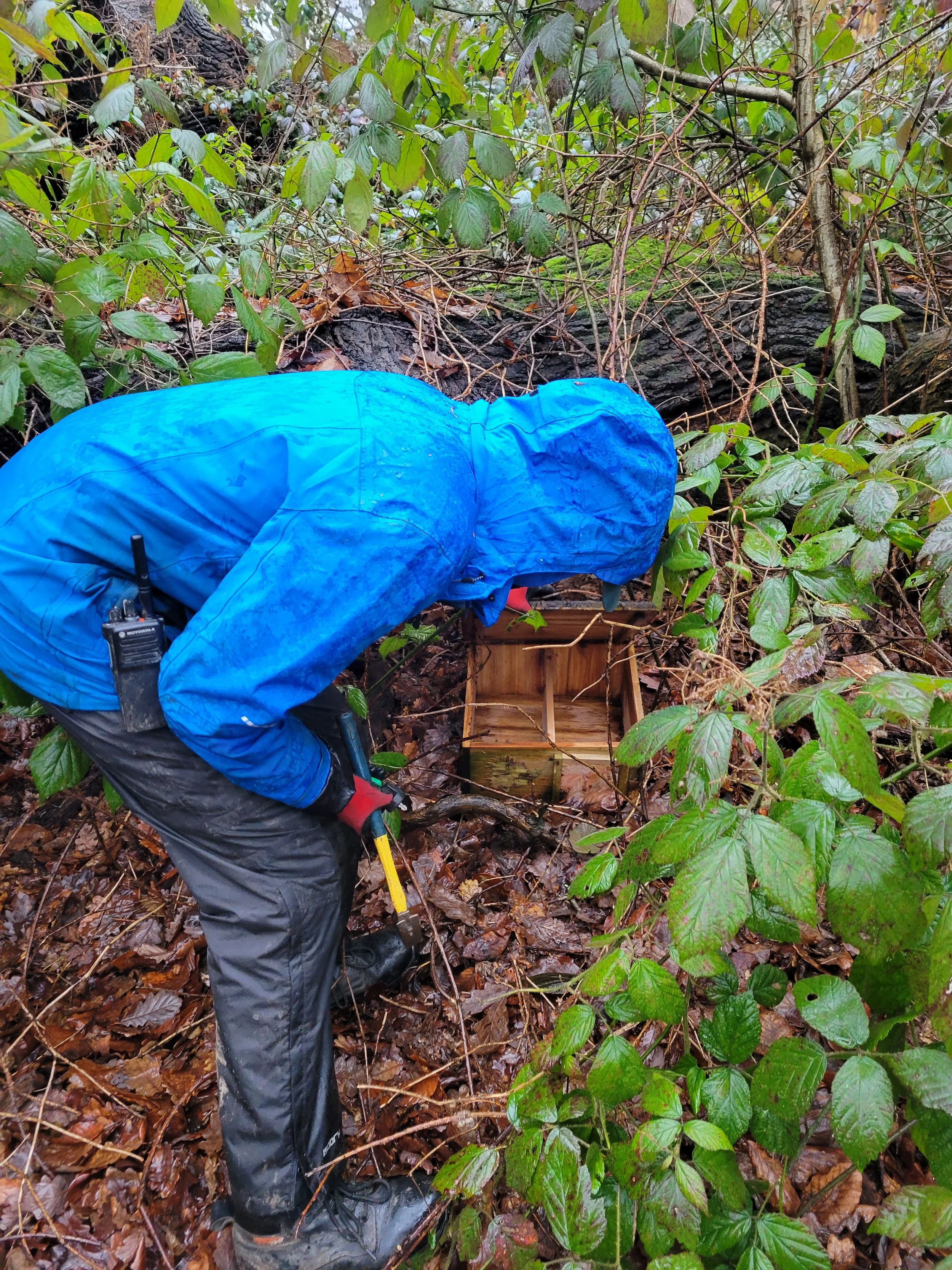 One of the team checking hedgehog boxes in the rain!