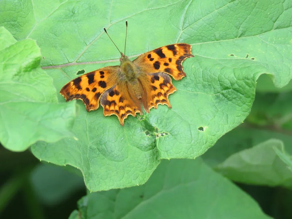A comma butterfly, recognisable by the black markings on its wings
